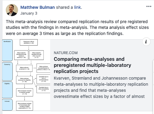 Comparing meta-analyses and preregistered multiple-laboratory replication projects We compare the results of meta-analyses to large-scale preregistered replications in psychology carried out at multiple laboratories. The multiple-laboratory replications provide precisely estimated effect sizes that do not suffer from publication bias or selective reporting. We searched the literature and identified 15 meta-analyses on the same topics as multiple-laboratory replications. We find that meta-analytic effect sizes are significantly different from replication effect sizes for 12 out of the 15 meta-replication pairs. These differences are systematic and, on average, meta-analytic effect sizes are almost three times as large as replication effect sizes. We also implement three methods of correcting meta-analysis for bias, but these methods do not substantively improve the meta-analytic results.